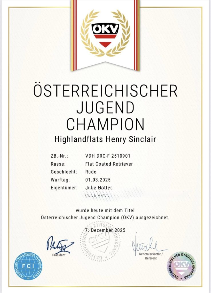 Er erhält – das erste Mal überhaupt ausgestellt – alle vier Ausstellungen in der Jugendklasse ein Vorzüglich mit CAC und bereits am Samstag konnte Julia (seine Besitzerin) den „österreichischen Jugendchampion“ beantragen