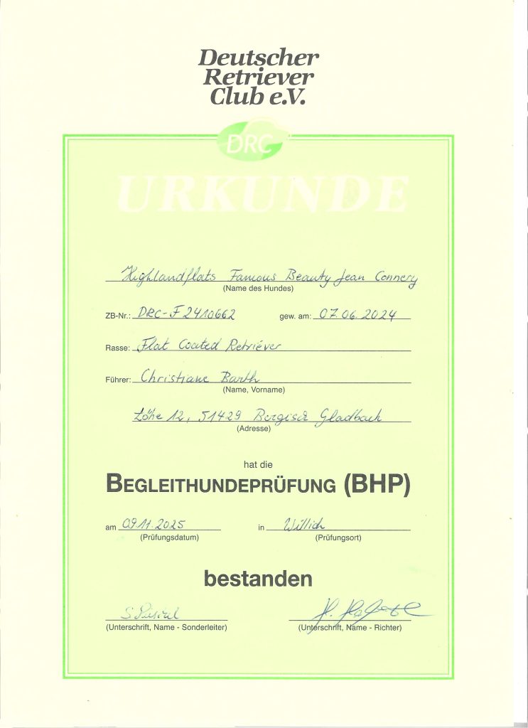 Conall – D JCH HIGHLANDFLAT FAMOUS BEAUTY JEAN CONNERY und ich sind bei der BZG Düsseldorf bei der Begleithundeprüfung gestartet und haben bestanden