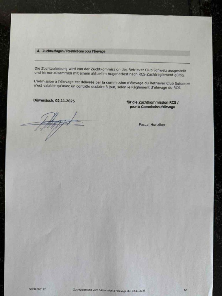 05. Oktober 2025 den Wesenstest in Studen – SCHWEIZ mit Bravour bestanden und nun die Zuchtzulassung vom RCS bekommen😍🎉.