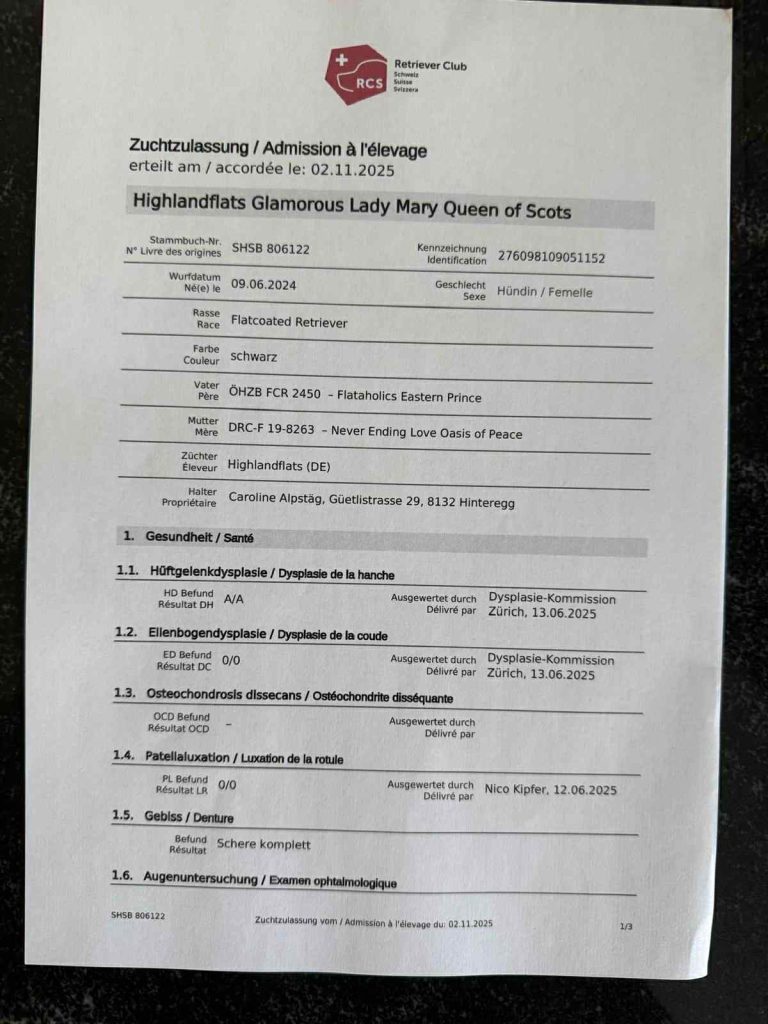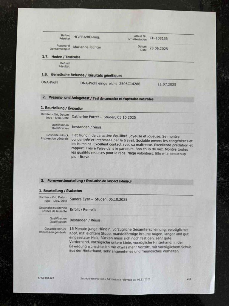 05. Oktober 2025 den Wesenstest in Studen – SCHWEIZ mit Bravour bestanden und nun die Zuchtzulassung vom RCS bekommen😍🎉.