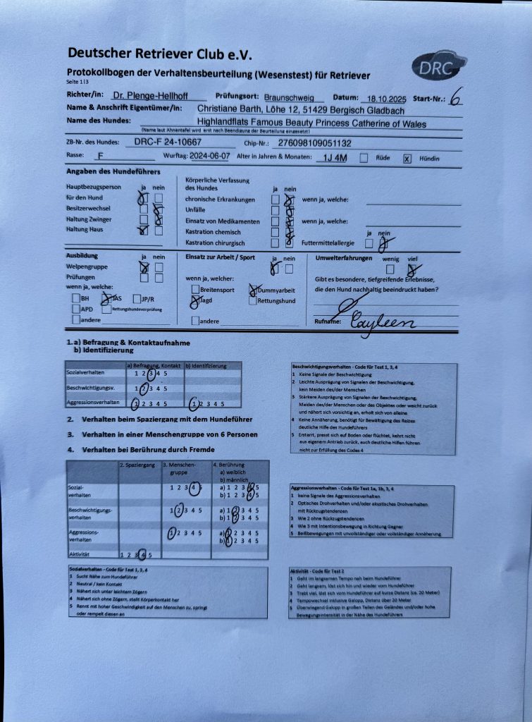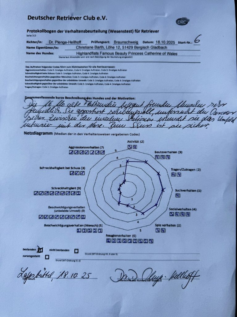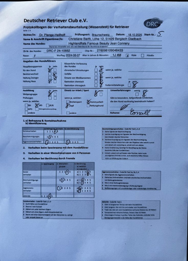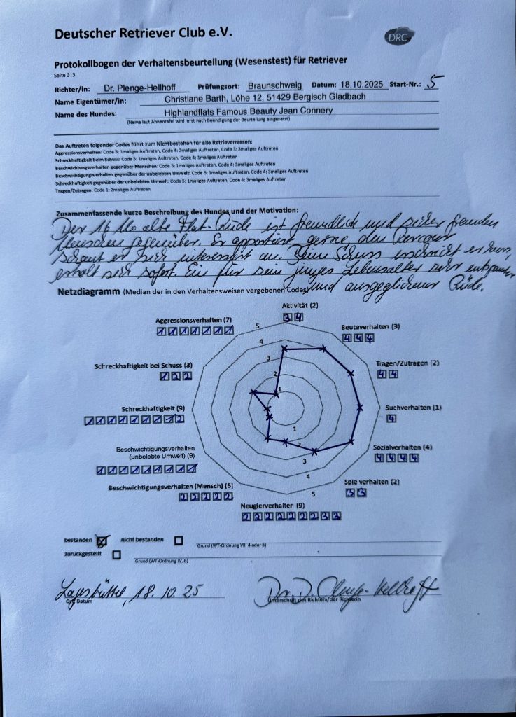 Für mich war dieser Tag mehr als nur eine Prüfung. Es war eine Bestätigung – für die Highlandflats, für Christianes Arbeit, für die Aufzucht und unsere Training. Aber auch eine Erfahrung, wie wichtig Vorbereitung, liebevolle Pflege und Vertrauen sind. Und wie viel Freude es macht, gemeinsam mit anderen in so einer coolen Hundefamilie unterwegs zu sein.