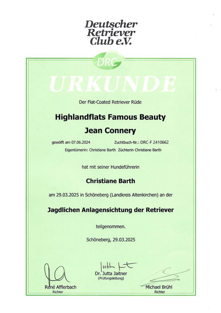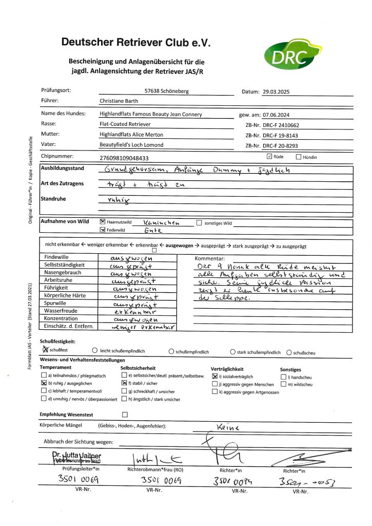 JAS (Jagdliche Anlagensichtung) für CONALL – Highlandflats Famous Beauty Jean Connery